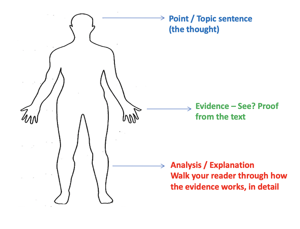 ANALYSIS/EXPLANATION (A/E) of how the evidence proves the point (red).